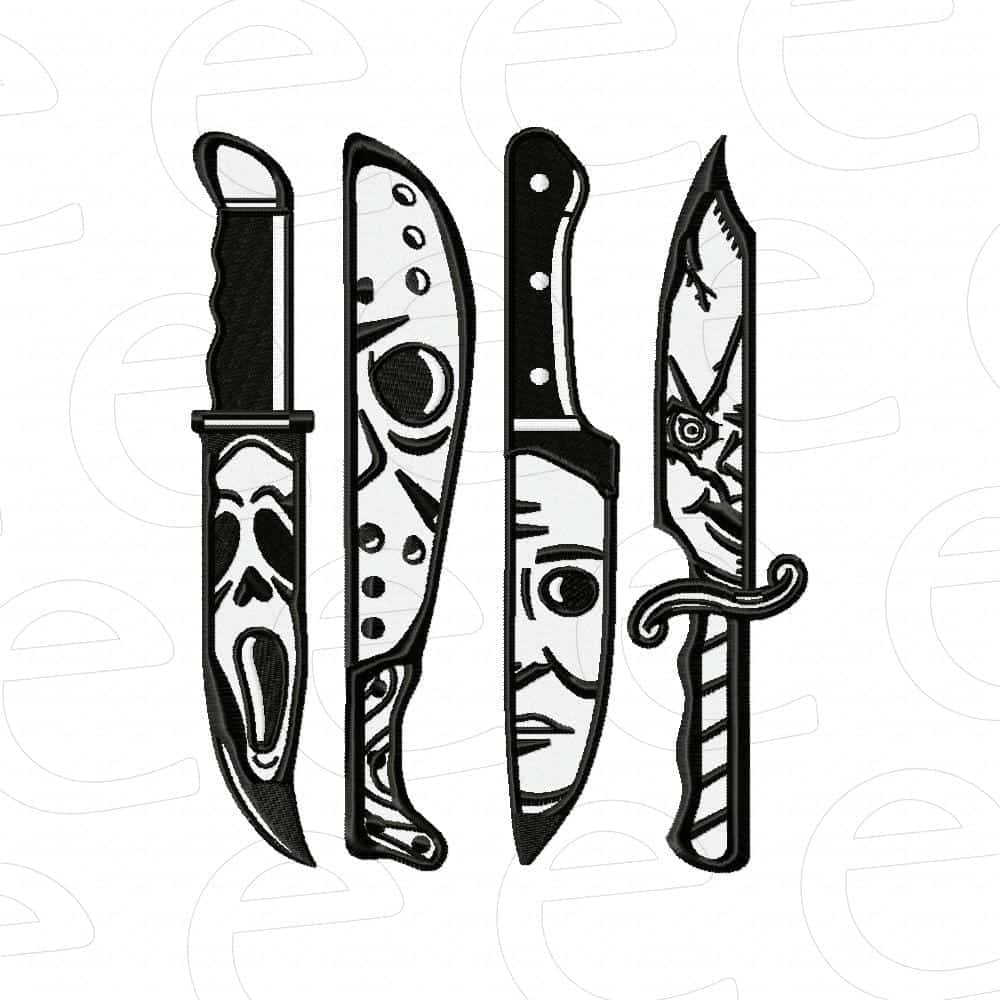 Download the Ghostface in hunting knife, Jason Voorhees in machete, Michael Myers in kitchen knife and Chucky in serrated knife collection. This horror movie character machine embroidery design package is a high-quality digital file available for instant download. Perfect for horror-themed apparel and commercial use on finished products. This listing includes the PES format compatible with most embroidery machines. Please note this is a digital embroidery machine design and no physical item will be shipped. Use the Ghostface in hunting knife, Jason Voorhees in machete, Michael Myers in kitchen knife and Chucky in serrated knife patterns for your next project.